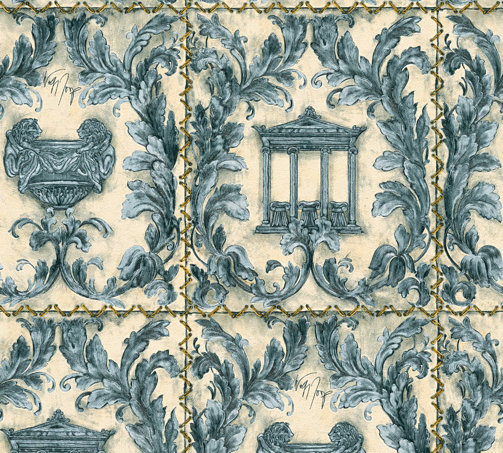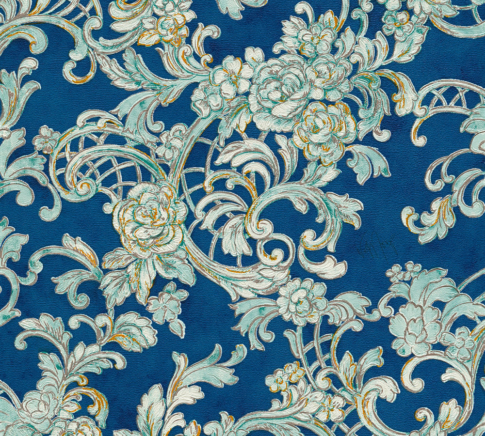 Kind of White Classic Damask Wall Paper Blue White Metallic 340771